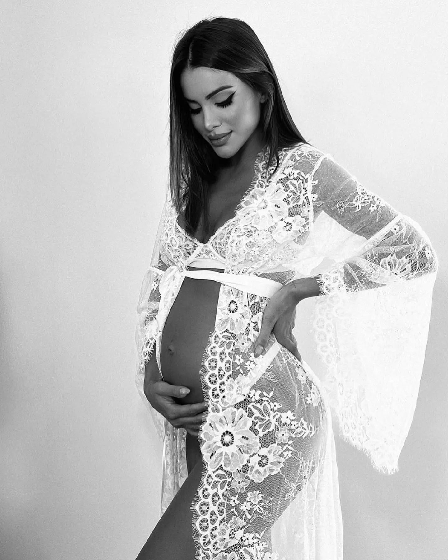 Turn your pregnancy photo shoot into a romantic bridal-esque moment with our Kassiah Long Lace Robe. This stunning long ivory lace robe will have you feeling like an absolute princess and ready for your maternity close up.