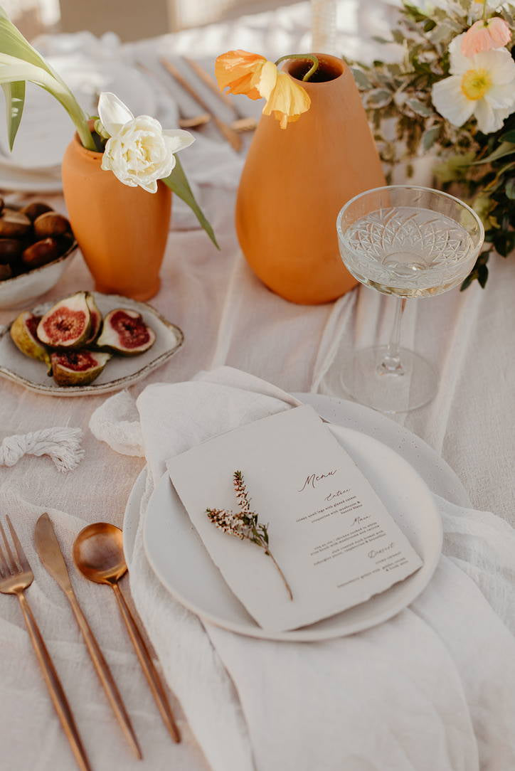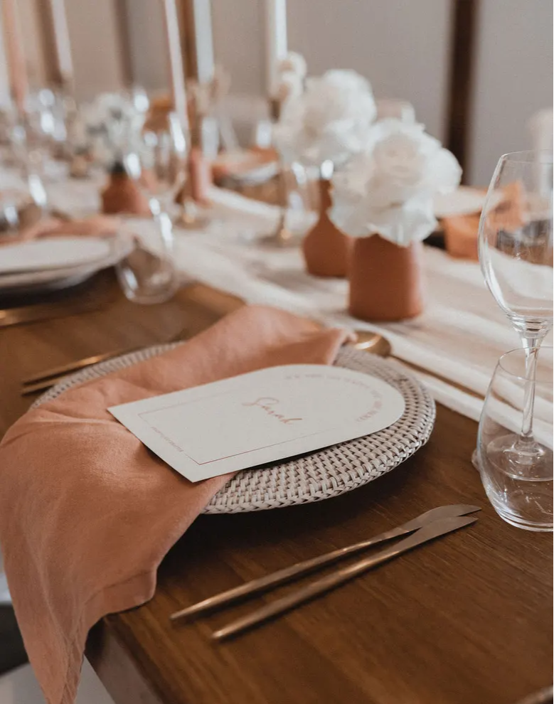 Once you’ve got your theme, it’s time to choose your linens or centrepiece! If you have a lovely table and you don’t want to cover it up, choose a centrepiece to compliment it nicely. But if you love the linen look, dress it up with a table cloth to suit the theme. Think plain white linen for a classic look, crochet for bohemian, stripes for French/Italian, or floral for a fresh English feel. Classic ideas for a centrepiece can be candles, fruit, and flowers.