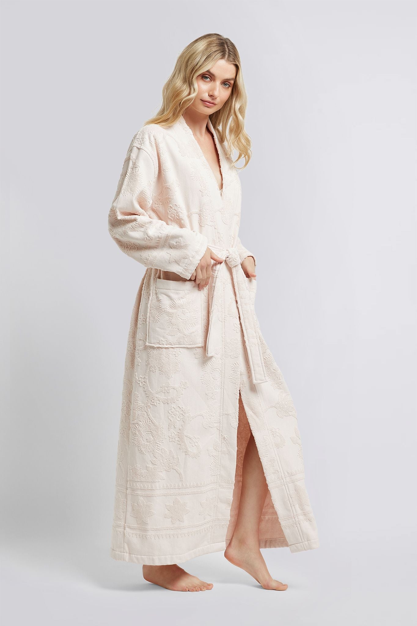 Crafted from luxurious cotton jacquard terry fabric, this robe provides the perfect blend of comfort and style for her relaxation time. From wrapping herself in its plush embrace after a soothing bath to lounging in bed with a good book, this robe ensures she feels pampered every step of the way. Its playful geometric motifs and relaxed silhouette add a touch of fun and elegance to her post-bath routine, making her feel like she's stepped out of a spa and into a cozy haven. With its secure belt closure, she can effortlessly customize her fit for the ultimate comfort.