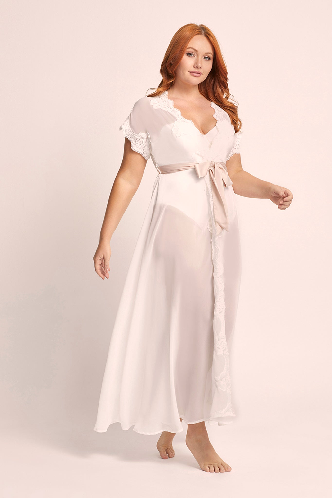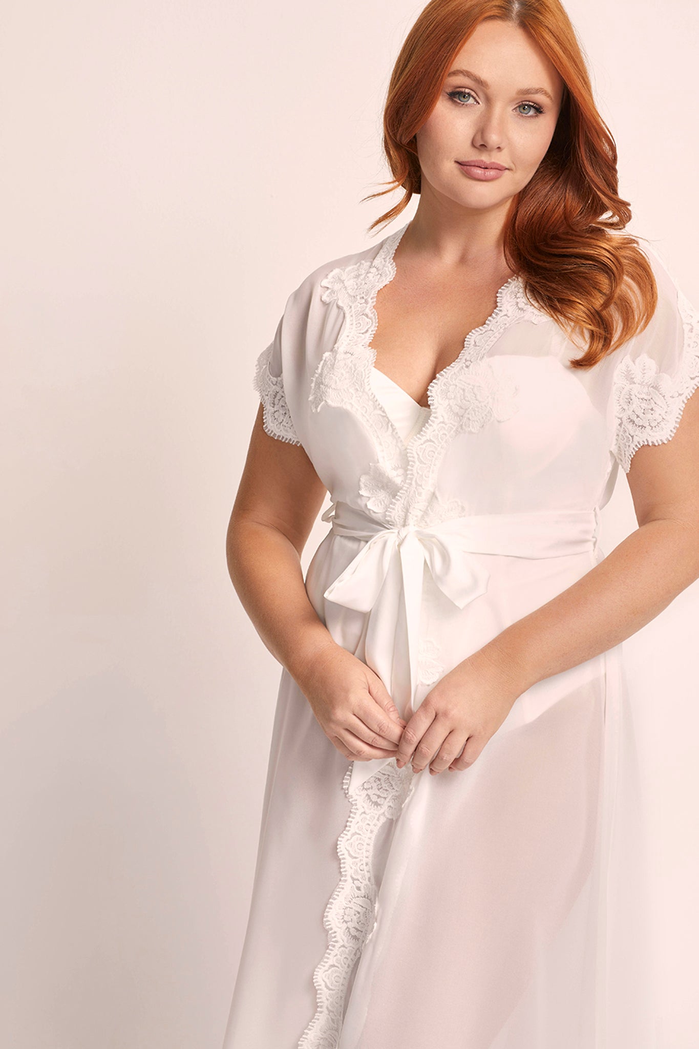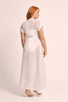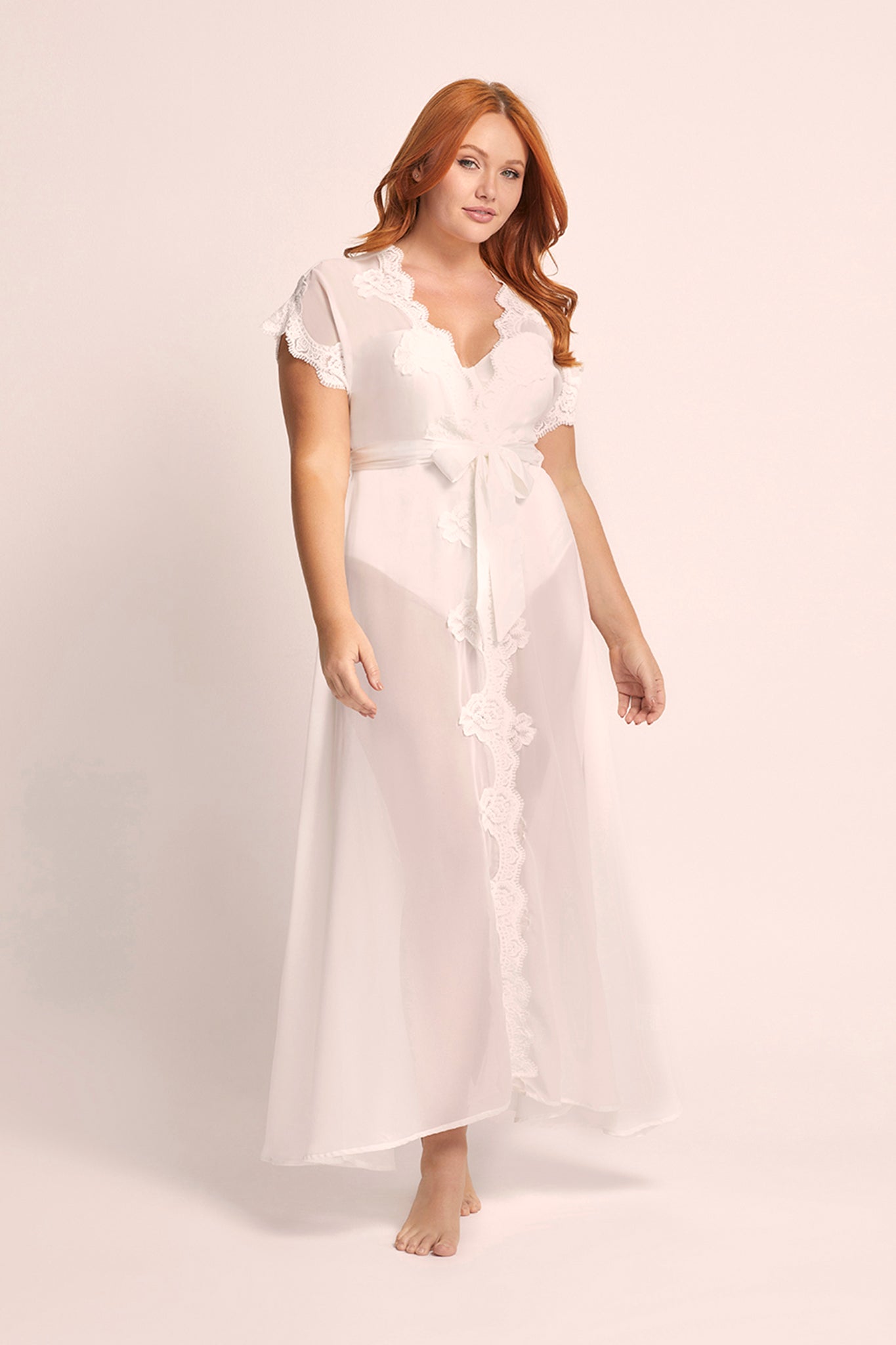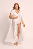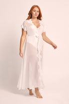 Crafted from semi-sheer white chiffon, the Farrah robe is adorned with a lavish display of elegant lace rosettes that cascade gracefully along its surface. The lace-cuffed sleeves add a touch of vintage charm, creating a harmonious blend of playfulness and sophistication that is simply irresistible.