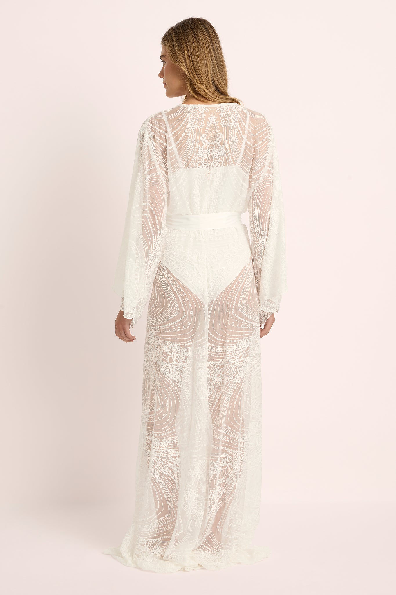 The soft silhouette drapes effortlessly across the body, with flowing kimono-style sleeves and a luxurious satin sash that cinches the waist for a flattering finish. The intricate lacework dances in the light, creating an elegant play of texture and transparency — a true celebration of detail and design.