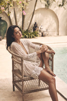 The silhouette features flowing kimono-style sleeves and a soft satin waist sash that defines the figure while keeping an effortless sense of ease. Intricate lacework frames the neckline, cuffs, and hem, creating a gentle contrast against the airy dotted tulle. Designed in Australia, the Chloe Robe captures the essence of bridal luxury — understated yet unforgettable.