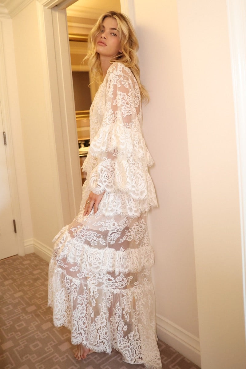 Wrap yourself in effortless romance with this layered French lace robe in soft ivory—an exclusive bridal piece made for unforgettable bridal mornings. Perfect for wedding day getting ready, photos with your bridal party, or as a beautiful bridal gift, it brings a touch of luxury to every moment.