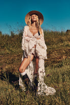 Crafted from delicate layered lace, it feels light and airy against the skin while creating a flattering, feminine silhouette. Intricate lace detailing through the sleeves and hem adds timeless elegance, while the adjustable self-tie waist lets you cinch the fit for comfort and shape.