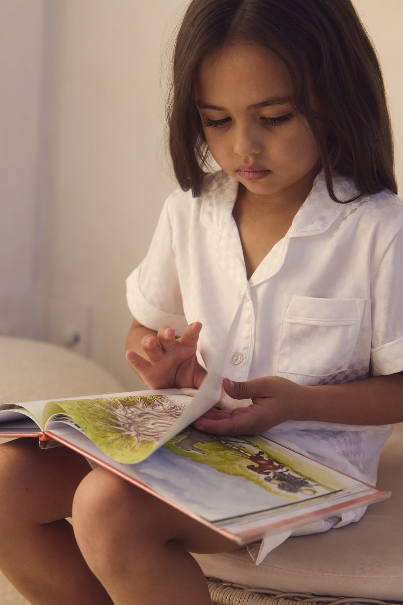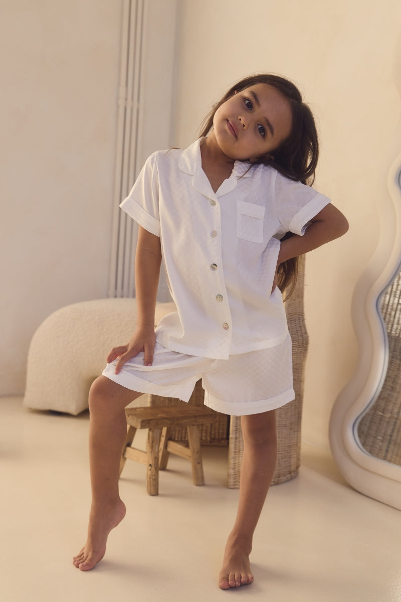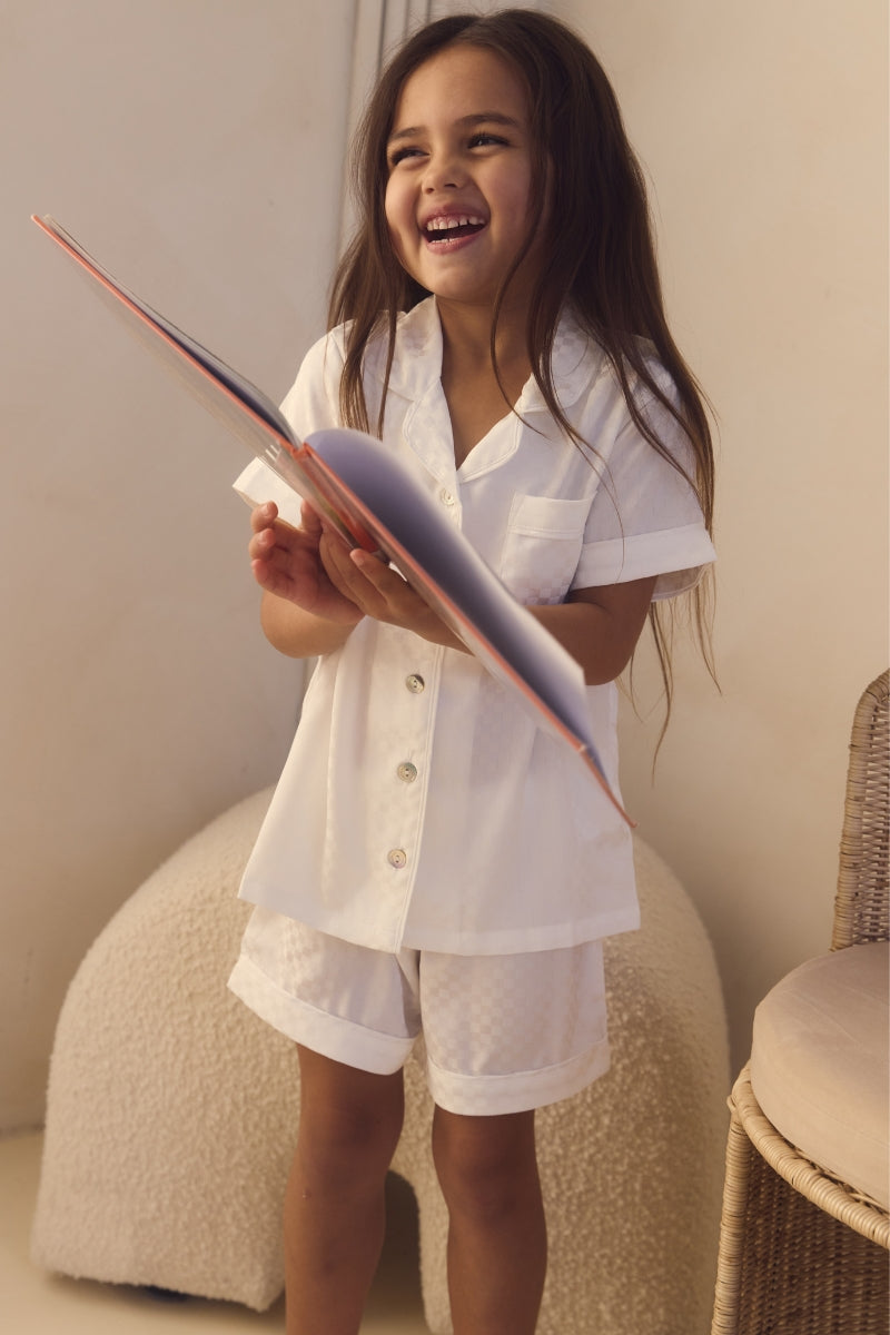 Matching Style: The Gigi Checked Satin Kids Short Set is designed to perfectly coordinate with our women's Gigi collection, allowing for stylish matching moments with mum or older siblings.