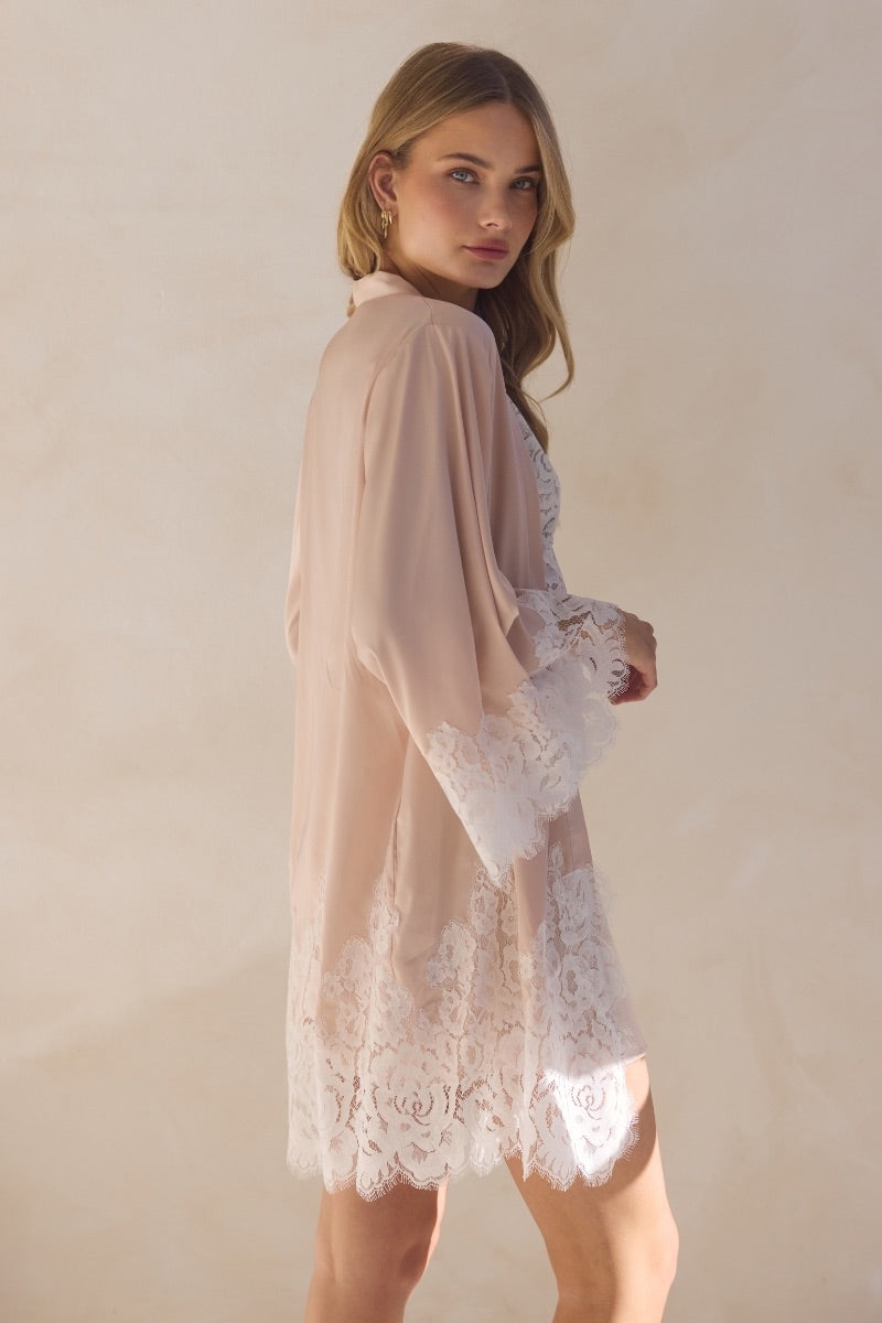 Delicate lace trim graces the sleeves and hem, adding an element of timeless romance, while the self-tie waist allows for a flattering, adjustable fit. Whether you're starting your morning routine or unwinding in the evening, this robe is the perfect blend of sophistication and ease.