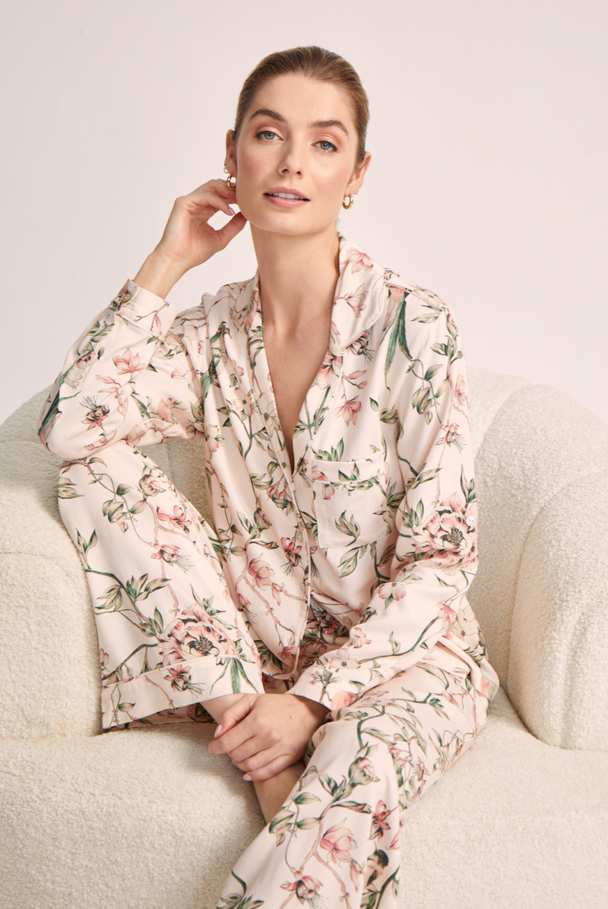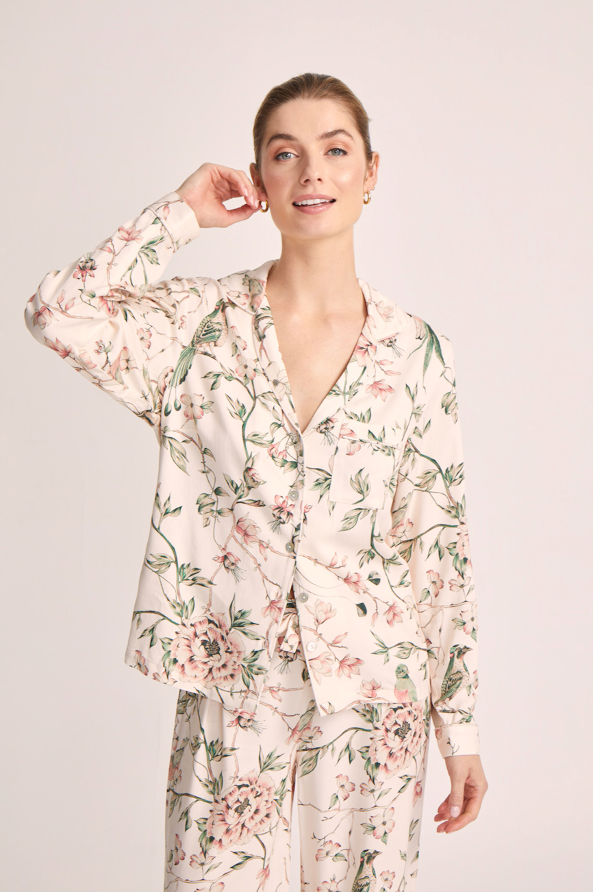 Our exclusively designed Botanica print in our pyjama lounge set is a beautiful balance between comfort and style. A luxuriously soft blush colour featuring a floral & bird print.