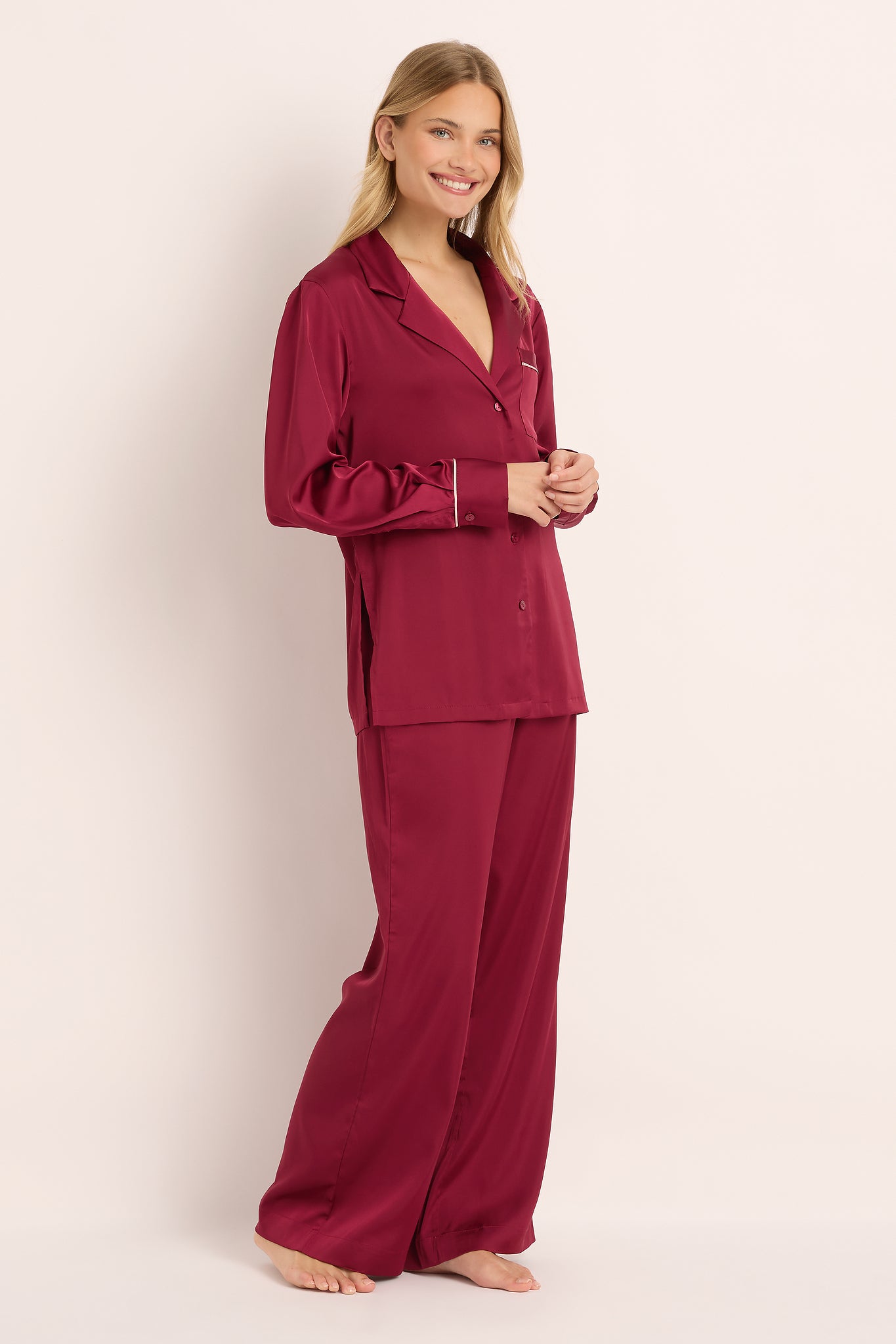 Crafted from our signature premium non-crush satin, the fabric drapes like silk and feels sumptuously soft against the skin, while its subtle sheen adds a festive glow. Whether you're unwrapping gifts by the tree or enjoying a quiet night in, the Grace Pyjama Set promises effortless sophistication from dusk till dawn.