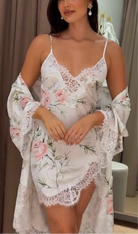 The robe’s delicate eyelash lace trim along the sleeves and hemline enhances its romantic aesthetic, while the scalloped lace edges add a refined, feminine finish. Designed with versatility in mind, it features a wrap front with hidden ties and a detachable satin belt, allowing you to adjust the fit to your liking. Whether you're getting ready on a special morning or unwinding at the end of the day, the Sofia Lilac Floral Robe offers both style and comfort.