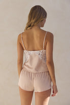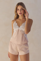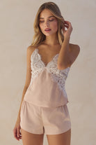 The cami top features delicate lace detailing along the neckline, adding a romantic touch, while adjustable straps provide a tailored fit. Paired with matching satin shorts,  this set is designed for both comfort and elegance.