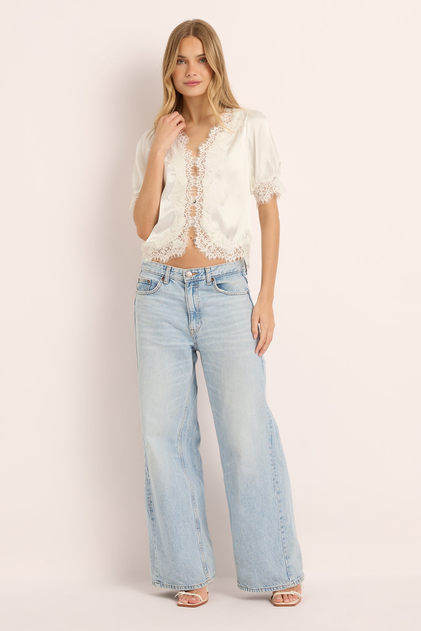 The top is delicately adorned with intricate floral cotton lace tracing the neckline, shoulders, cuffs, placket, and hem. Buttons trail down the center front, adding a nostalgic, heirloom finish. The matching shorts mirror this softness, creating a relaxed yet refined silhouette designed for languid mornings and moonlit evenings.