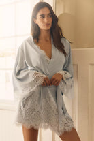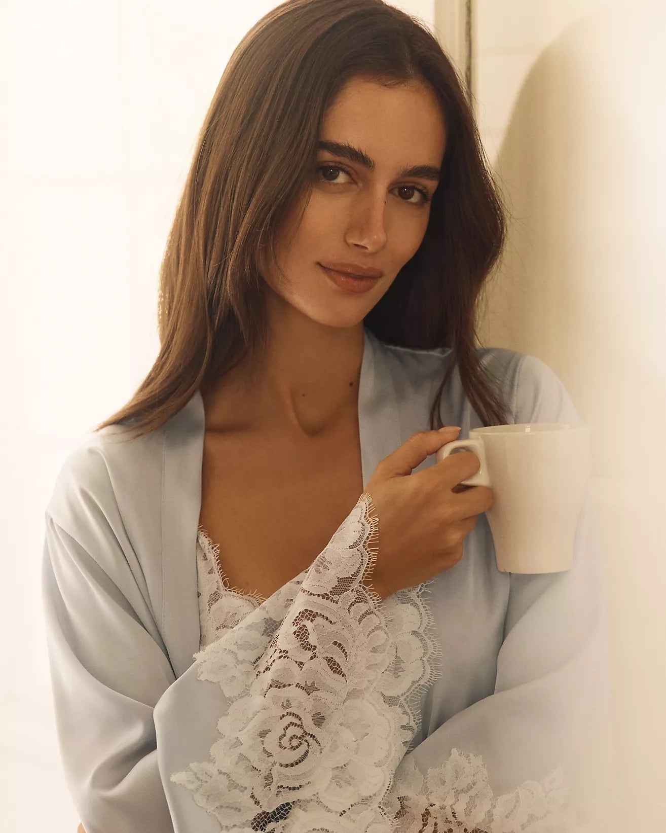 Delicate lace trim graces the sleeves and hem, adding an element of timeless romance, while the self-tie waist allows for a flattering, adjustable fit. Whether you're starting your morning routine or unwinding in the evening, this robe is the perfect blend of sophistication and ease.