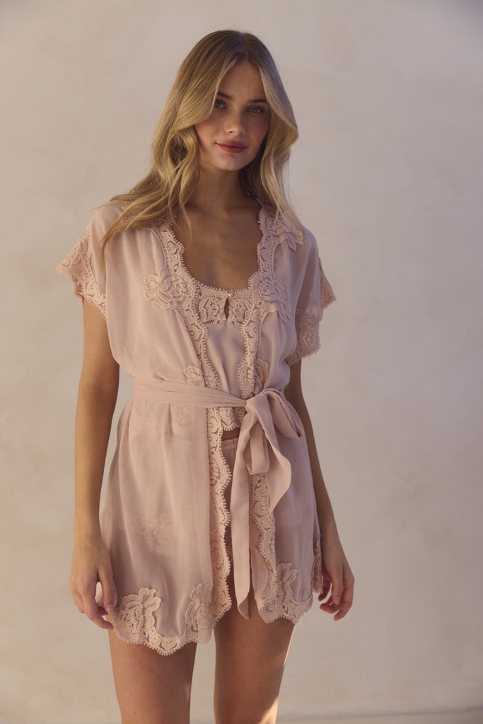 The short sleeves offer a light and breezy feel, making it ideal for warmer days or layering over your favourite sleepwear. Whether you're getting ready for a special occasion, enjoying a relaxing morning, or embracing a quiet evening, the Valentina Robe envelops you in luxury and style.